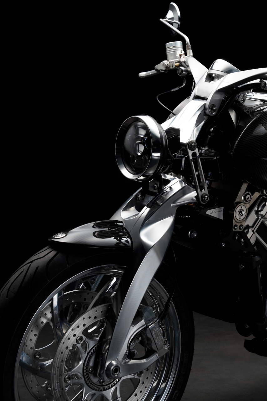 Fior-type fork on the Lawrence a Brough Superior trademark of sortsThe brand’s next creation was the AMB 001, created with collaboration from Aston Martin. Boasting a 997cc turbocharged v-twin making 180bhp, it too weighed just 180kg (dry weight). And as expected, it boasted exclusive technical features, including a chassis configuration with a double-wishbone front fork and structural carbonfibre body, inspired from the new series of mid-engined Aston Martin cars.