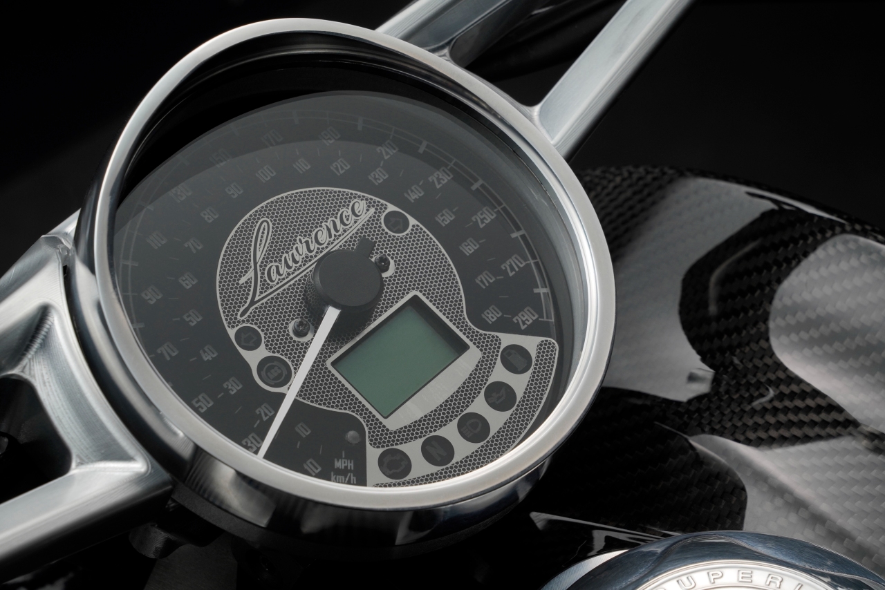 Semi-digital guage takes pride of place on the Lawrence's one-piece machined aluminium handlebarA unique attribute of the Lawrence is the handlebar, made from a single machined piece of aluminium, taking centrestage on which is a single-pod semi-digital cluster. Moving finally to the powerplant, and it gets the same 997cc v-twin from the AMB 001, though this time it isn’t turbocharged. On offer is is 102bhp at 9600rpm, and 87Nm at 7300rpm, mated to a 6-speed ‘box. Braking duties are taken care of by a pair of 320mm discs up front chomped upon by a four-piston caliper setup by French specialists Beringer, while the rear gets a 230mm disc with a two-piston caliper.