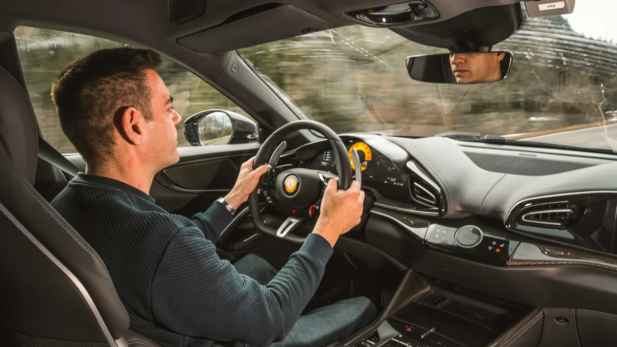 It really is a glorious engine and imbues the whole car with a sense of exotic sophisticationThere’s so much more technology here. From the latest Side Slip Control 8.0, Grip Estimation 2.0 (which works with SSC to estimate tyre grip more accurately by taking load information from the electric power steering), ABSevo, which better distributes braking force and was first seen on the 296 GTB, plus a four-wheel-steering system that can control the angle of each rear wheel independently and was introduced on the 812 Competizione. Perhaps the biggest revolution concerns the Ferrari Active Suspension Technology, which utilises a new Multimatic system that does away with anti-roll bars completely. Each damper is fitted with an electric motor, which can apply force to counteract body roll and speed or slow the wheel’s movement to ensure a stable contact patch. The battery to power (and cool) the dampers is located beneath the driver’s seat.