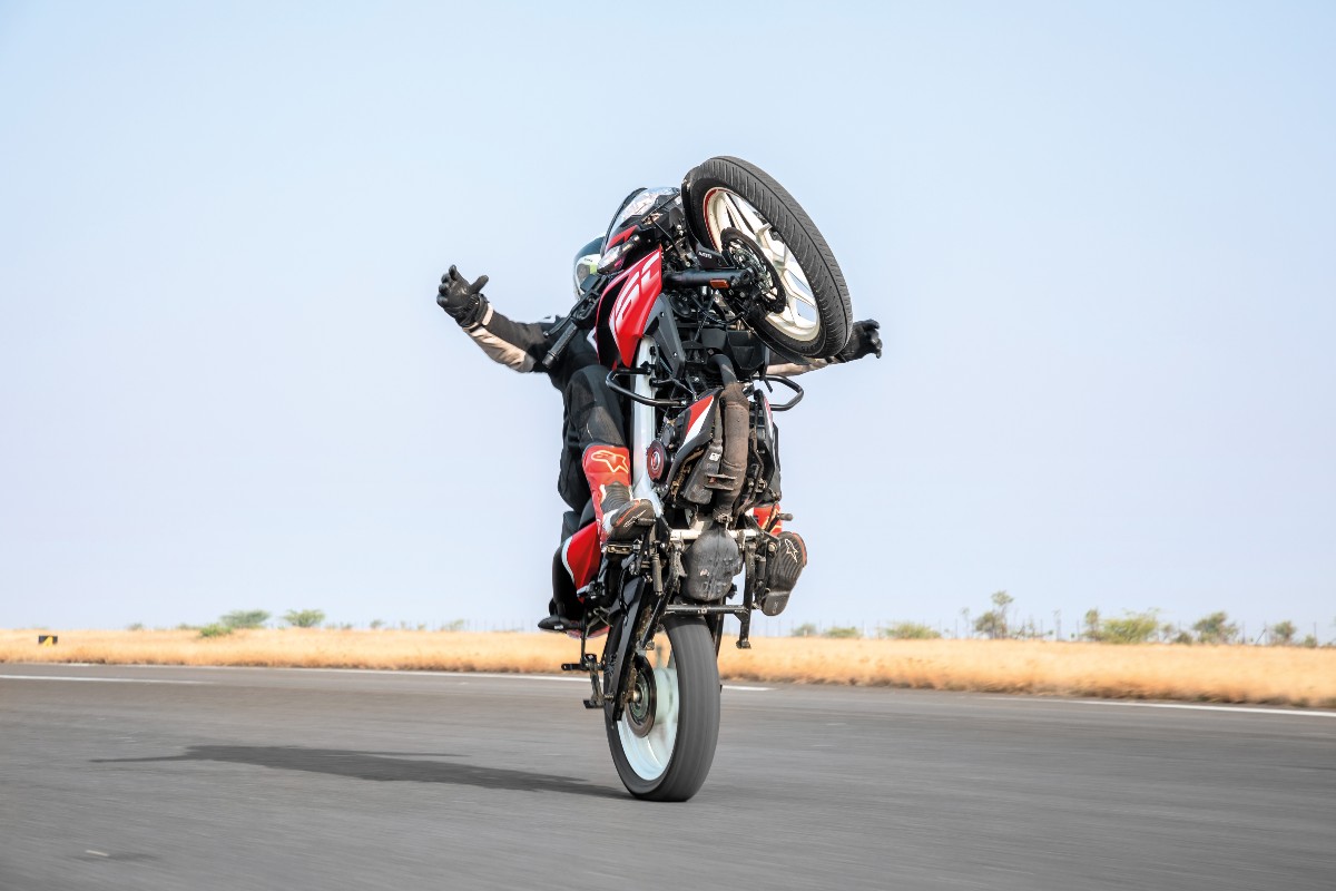 Hrishi Mandke on the Bajaj Pulsar NS 160 attempting to break the recordHrishi’s brow was furrowed, half from the heat radiating off the miles of sun-baked tarmac in the treeless landscape, and half due to his own resolve of once again stamping his authority in the rarefied arena of professional stunting. A final gear-check: helmet, jacket, gloves, boots, all secured. He got astride the Bajaj Pulsar NS 160 and pressed the ignition. Building up the revs, he popped the clutch, bringing the bike up on the rear wheel, hooked his left boot under the peg and then, took his hands off the ’bars! Using only his core strength, he hung onto the bike as it barreled down the runway; thirty metres, forty, fifty, sixty… and then the front wheel came back down with an almighty thud. Hrishi’s brow was once again furrowed. He had a record to beat, and only two more attempts left.