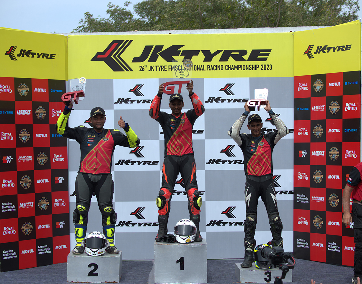 Winners of JK tyre Royal Enfield Continental GT CupIn the first race on Day 1, Chennai’s R Anand had his hands full with an incident- filled race which even saw a restart due to the severity of crashes and stoppages affecting the race. However, even after the restart, amid late-race pressure from Md Samrul Zubair, Anand held his nerve to deliver the victory. Abhishek Vasudev grabbed the final place on the podium, a testament to his pace in the 2023 season.