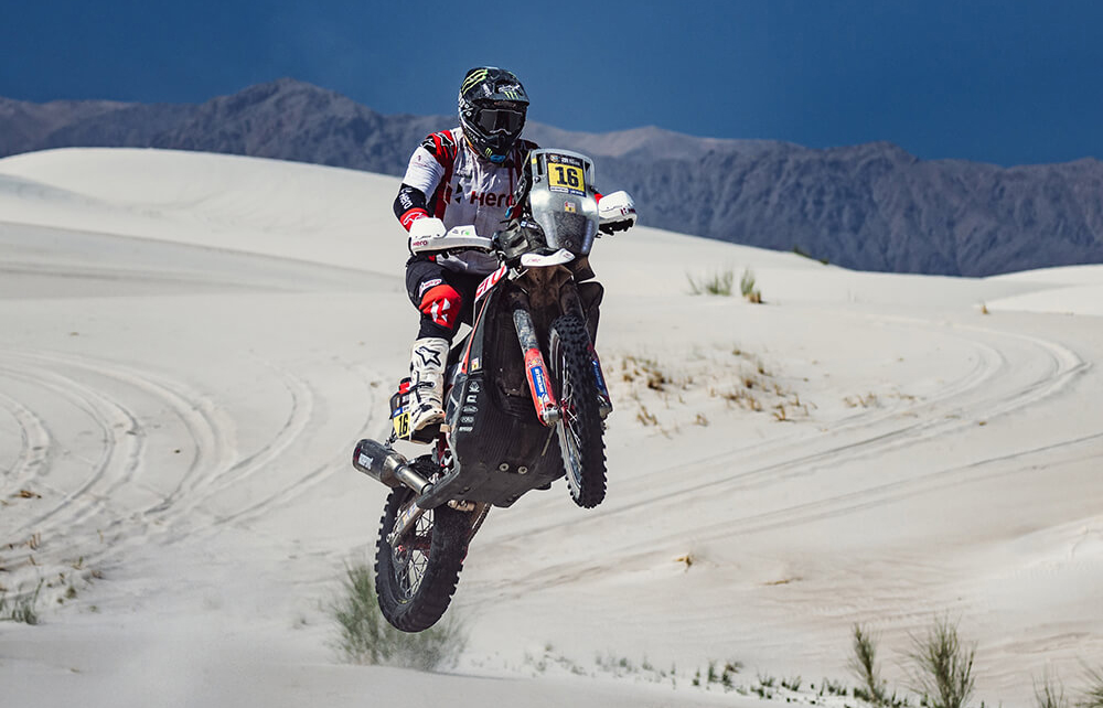 Ross Branch secured a second place finish on the final stageFinishing a strong P8 and P9 in the prologue, Hero had a tough first stage, which was also the longest, covering 700km of the total route. However, the gruelling stage ended with Ross Branch a respectable fifth and Buhler in eighth place. Progress continued over the 339km second stage as Branch improved to fourth place and Buhler consolidated a tough stage in ninth. Stage three saw Branch take another fourth place with Buhler in sixth place as the riders faced extreme cold and high altitudes in the mountains of Argentina. Stage 4 was bittersweet for the team as Sebastian Buhler had to exit the rally with mechanical trouble in the remote and unforgiving Fiambalá dunes, having to be extracted and thus not allowed to carry on with the rally. This left Branch as the sole Hero rider in sixth place. For the final flourish, Branch produced a gem of a ride which saw him secure a stage podium in the fifth and final stage with a second place finish, ultimately leading to a fourth place finish overall. This however turned into a third place overall finish as the winner, Tosha Schareina, was not part of the World Rally Raid Championship.