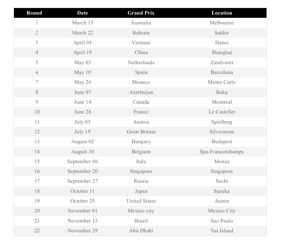 The season kicks off in Australia yet again with Abu Dhabi GP closing the season. The race will take place at two new circuits this season in the Netherlands and Vietnam. The Dutch one will be held at the new Zandvoort track that will be ready soon. Yes, the Dutch GP has returned to the calendar along with the new Vietnam GP which will be held on a street circuit in Hanoi. Vietnam will now be the fourth Asian track in the calendar along with China, Singapore and Japan.