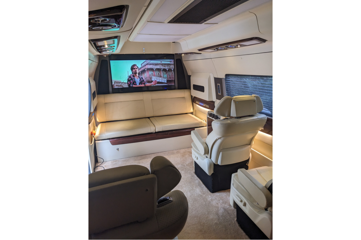 The interior of the Force Traveller caters to the politician and public figureThe Force Traveller is a more stylised and focused vehicle custom-made for a particular audience. With seven seats (three of which are powered with ottomans) and the same partition and television as the Innova, it offers much the same luxurious experience. However, there is also a chemical toilet, mini-pantry and the pièce de résistance, a platform which rises to the roof along with a public announcement system. Obviously, this car is aimed at the most discerning travelling politicians among us. The hydraulic lift raises the platform to allow politicians to address crowds from above. The Traveller conversion takes about 3 months and costs ₹85 lakh, which includes the cost of the donor car as well.