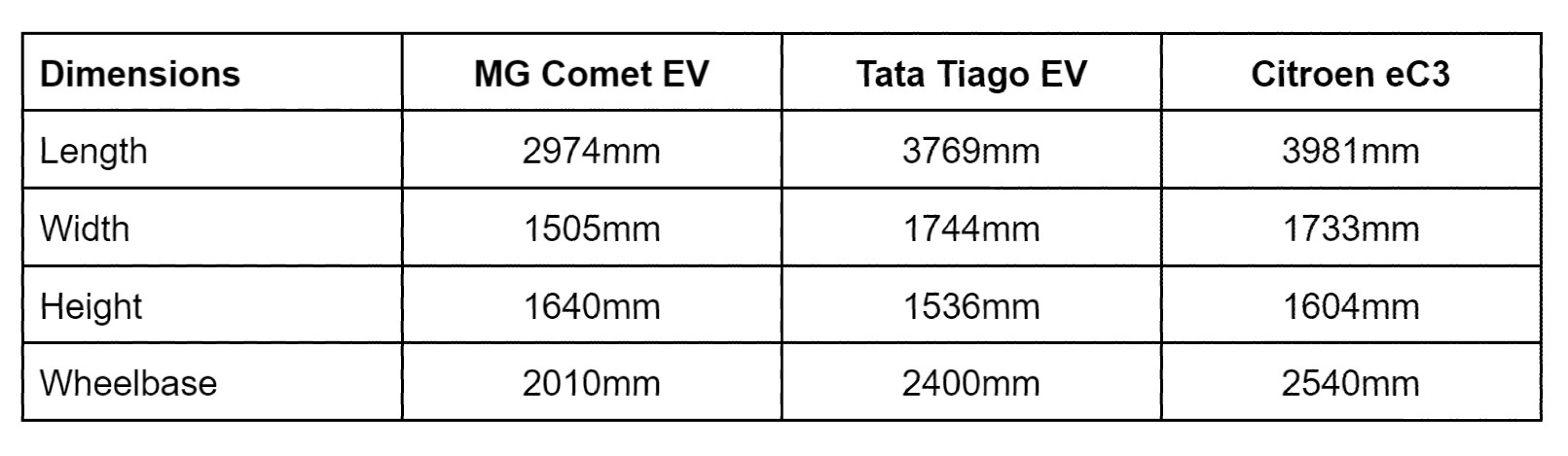MG Comet EV v Tata Tiago EV v Citroen eC3 : Dimensions