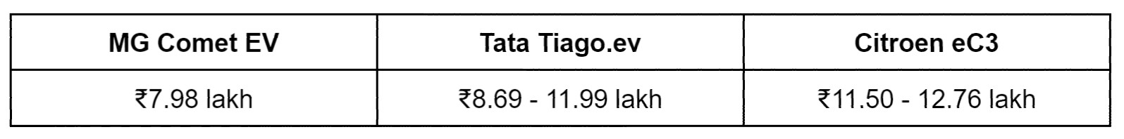 MG Comet EV v Tata Tiago EV v Citroen eC3: Price
