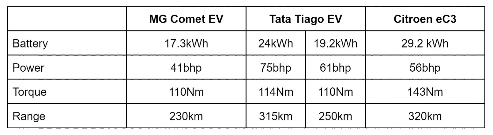 MG Comet EV v Tata Tiago EV v Citroen eC3 – specifications and prices compared